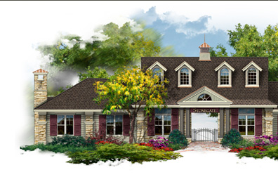 The Amenity Center for the new development in North Carolina, Stonegate, has a traditional style residents club with a stone and siding exterior. The club has a social room and a cabana for the pool area.